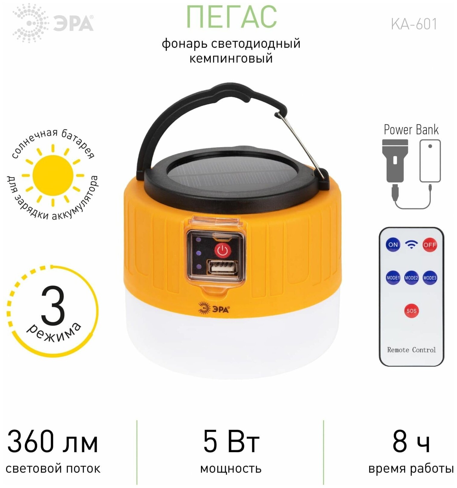 Фонарь ЭРА KA-601 кемпинговый светодиодный аккумуляторный подвесной походный Фонарик usb для туризма рыбалки Пегас на солнечной батарее