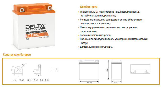 Отзывы на Аккумулятор AGM стартерный герметичный Delta CT 1205.1 |YB5L-B, 12N5-3B (12V / 5 Ah / 120х61х129 мм / ток 65 А) обратная полярность (- +)