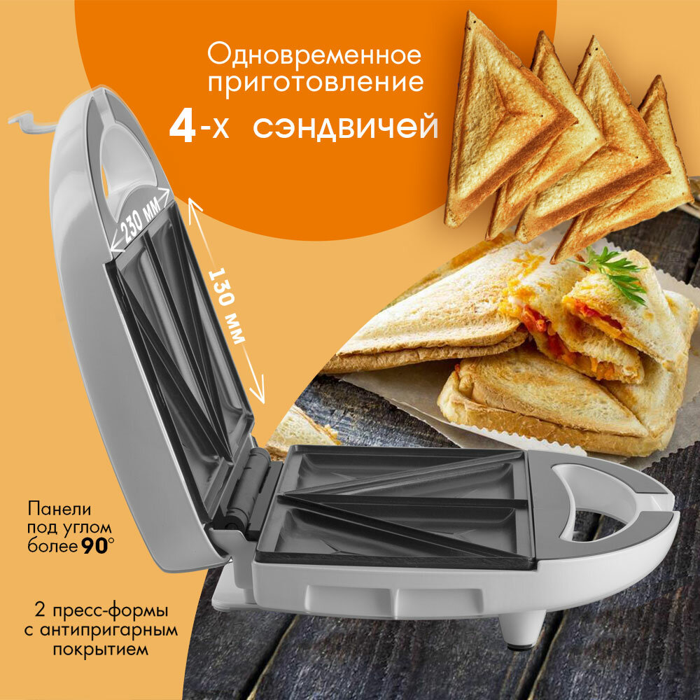 | Дополнительная информация | Одновременное приготовление 4 сэндвичей, Корпус их термостойкого биопластика, Эргономичная ненагревающаяся ручка, Автофиксация для облегчения закрывания, Вертикальное хранение |