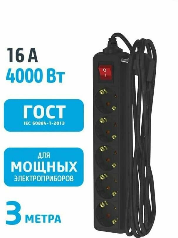 10 цен на Удлинитель сетевой "фотон" 16-35ЕS, 3м, 5 розеток, 16А, с выкл., с заземл., Черный