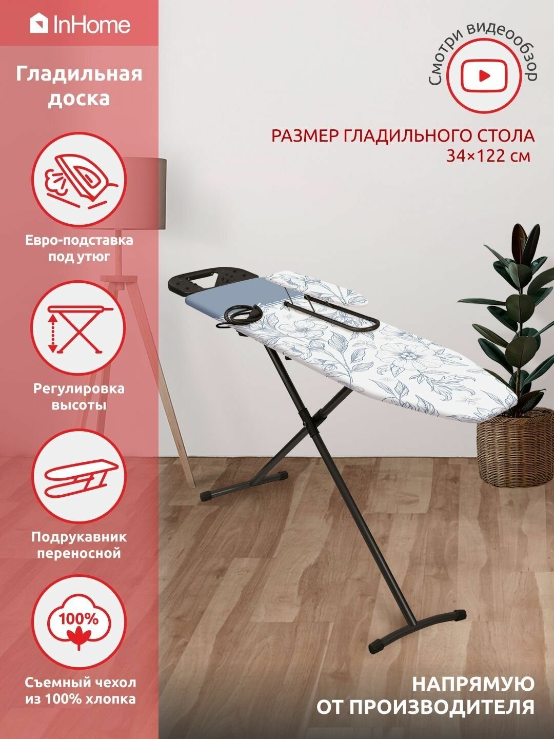 Отзывы на Гладильная доска металлическая с розеткой, полкой и подрукавником InHome IN3M/4