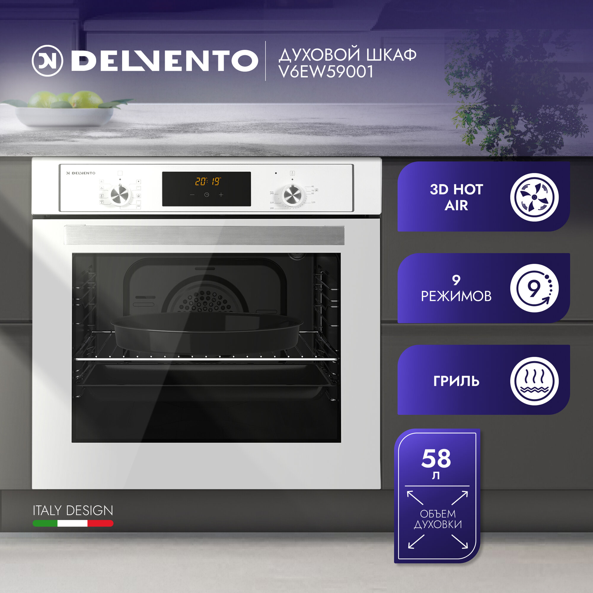 Духовой шкаф электрический встраиваемый 60см белый / 9 режимов (гриль + конвекция) / DELVENTO V6EW59001 / дисплей / таймер 90 мин, часы / двойное стекло LOW-E / хром. решетка и 2 противня: стандартный + круглый / подсветка / гарантия 3 года / 34 990 ₽
