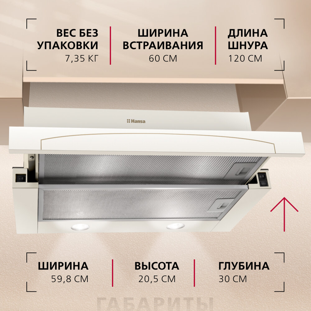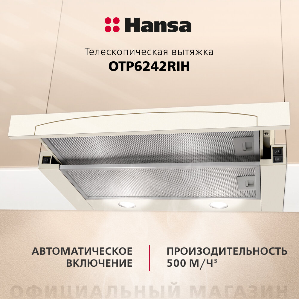 Телескопическая вытяжка Hansa OTP6242RIH, 60 см, механическое управление, 3 скорости, режимы отвода и рециркуляции, светодиодная подсветка, цвета слоновой кости 8 450 ₽