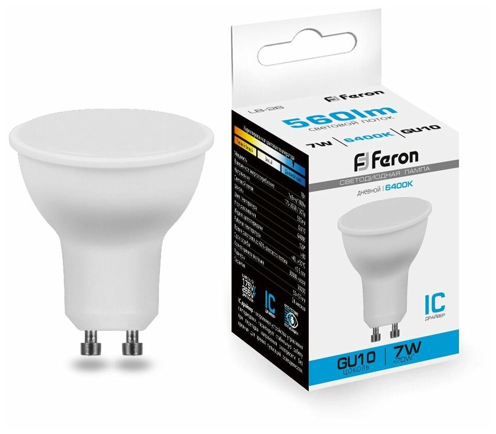Feron MR16 GU10 230V 7W(560lm) 6400K 6K матовая 57x50, LB-26 25291 (арт. 620072)