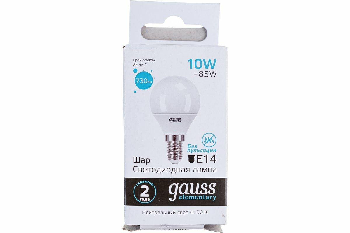(15 шт.) Светодиодная лампочка Gauss Elementary Шар G45 E14 10W(730lm) 4100K 4K 86x45 матовая, пластик/алюм. 53120 Нейтральный белый. Цоколь E14 4 103 ₽