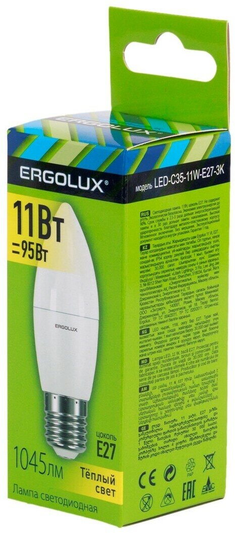 Эл.лампа светодиодная Свеча LED-C35-11W-E27-3K (11Вт=95Вт 905Lm E27 3000K 172-265В) Ergolux информация: