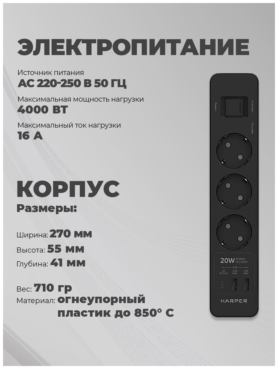 Сетевой фильтр HARPER UCH-430 Black PD3.0 3р/3м/2xUSB/Type-C/220-250V 50Hz 7 080 ₽