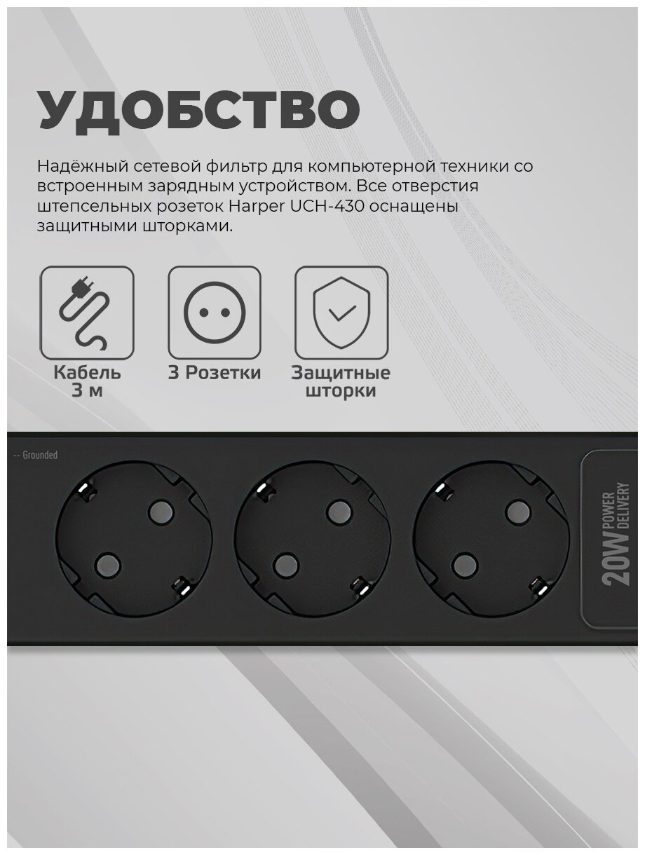 Сетевой фильтр Harper UCH-430 black PD3.0 (3 розетки, 2 USB-порта, 1 порт Type-C, 3 метра, шторки, встроенная защита от скачков напряжения и тока) 3 990 ₽