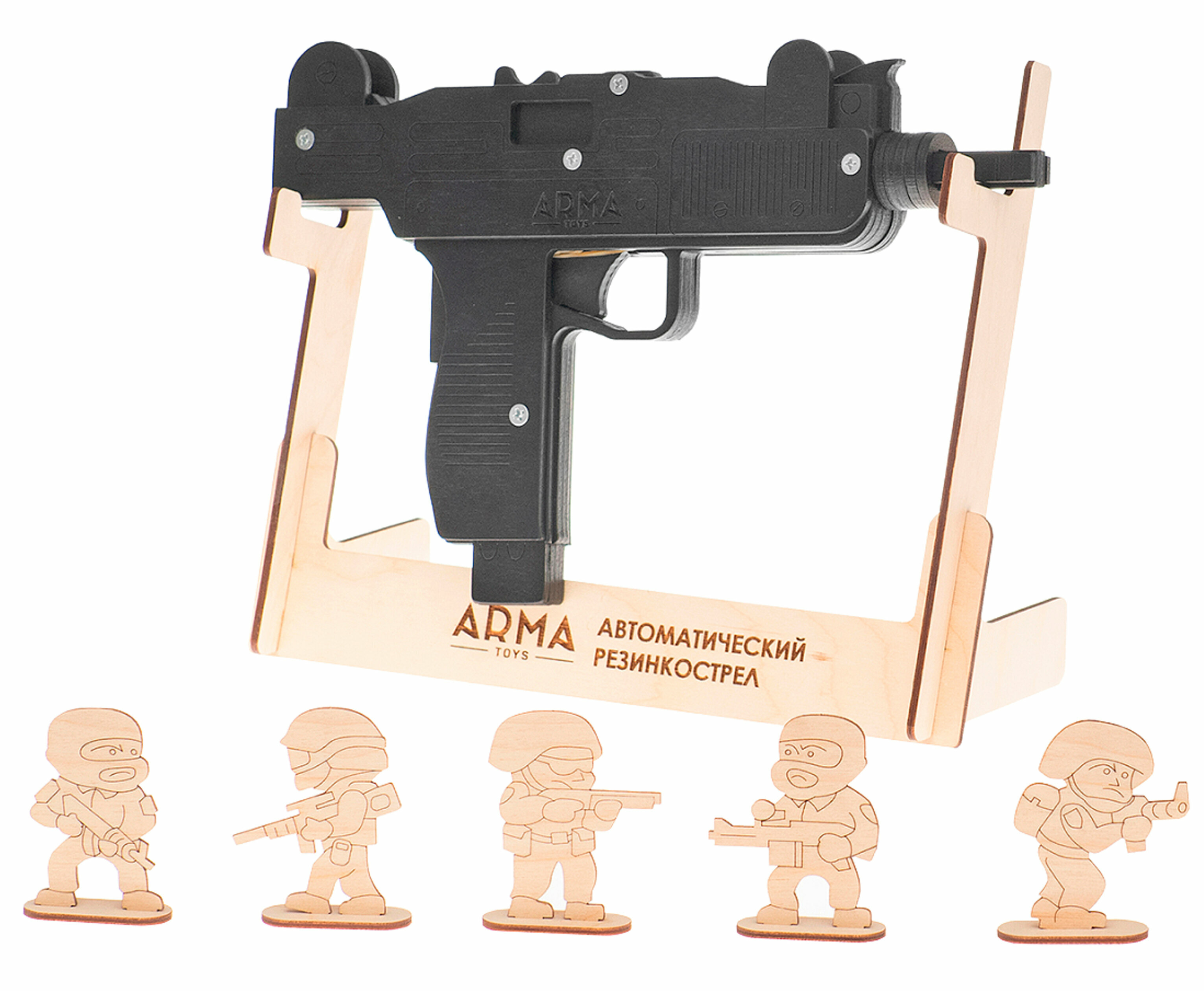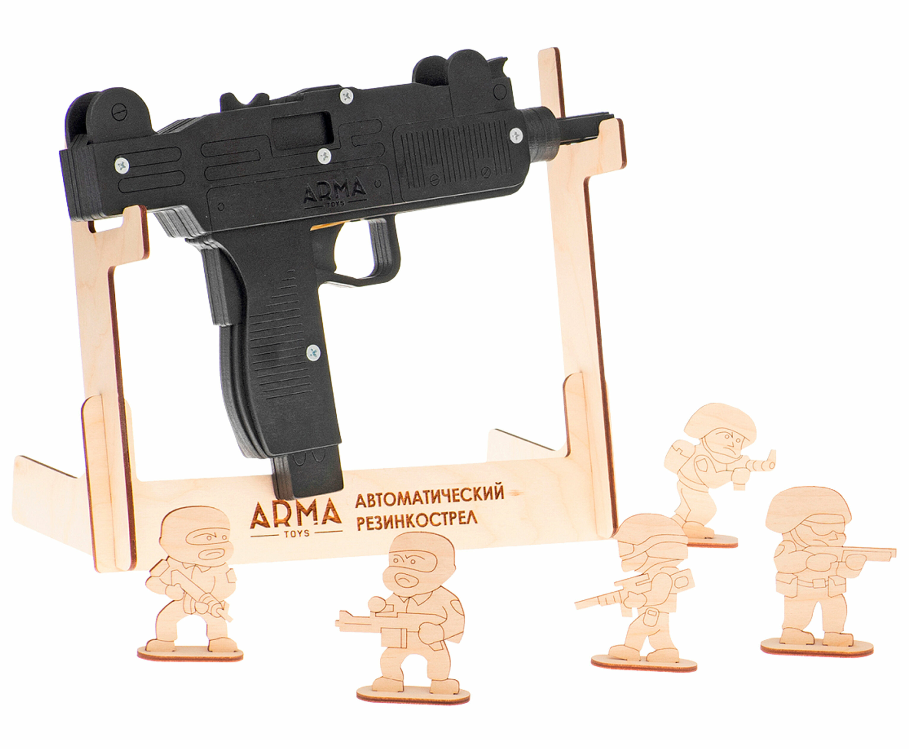 | Дополнительная информация | сделан из березовой фанеры 1-го сорта; нержавеющая металлическая фурнитура; покрыт акриловой краской на водной основе; заряды в комплекте из 100%-ного каучука; покраска и сборка производятся вручную; для детей от 3 лет |