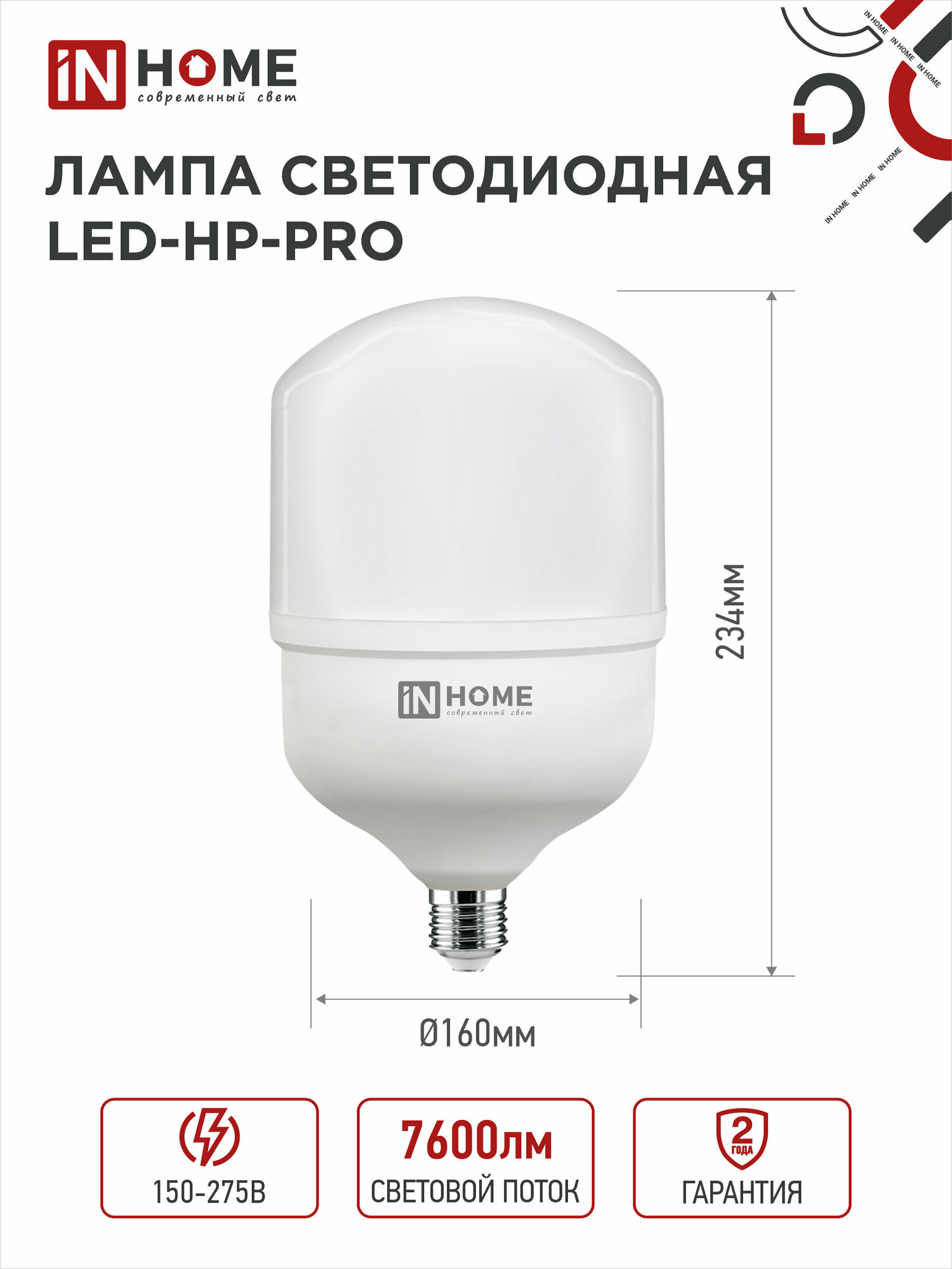 Лампа светодиодная IN HOME LED-HP-PRO, 80 Вт, 230 В, E27, с адаптером, Е40, 6500 К, 7600 Лм 1 124 ₽