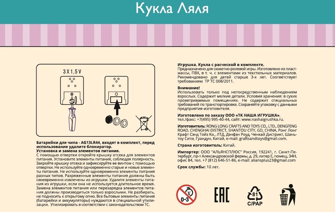 | Дополнительная информация | при нажатии на животик кукла произносит следующие фразы: «Здравствуй!», «Я кукла Ляля», «Поиграй со мной», «Мне с тобой очень весело!», «Я хочу кушать», «Я хочу спать», «Я проснулась», «Пойдём гулять?» и «Я очень тебя люблю!» |