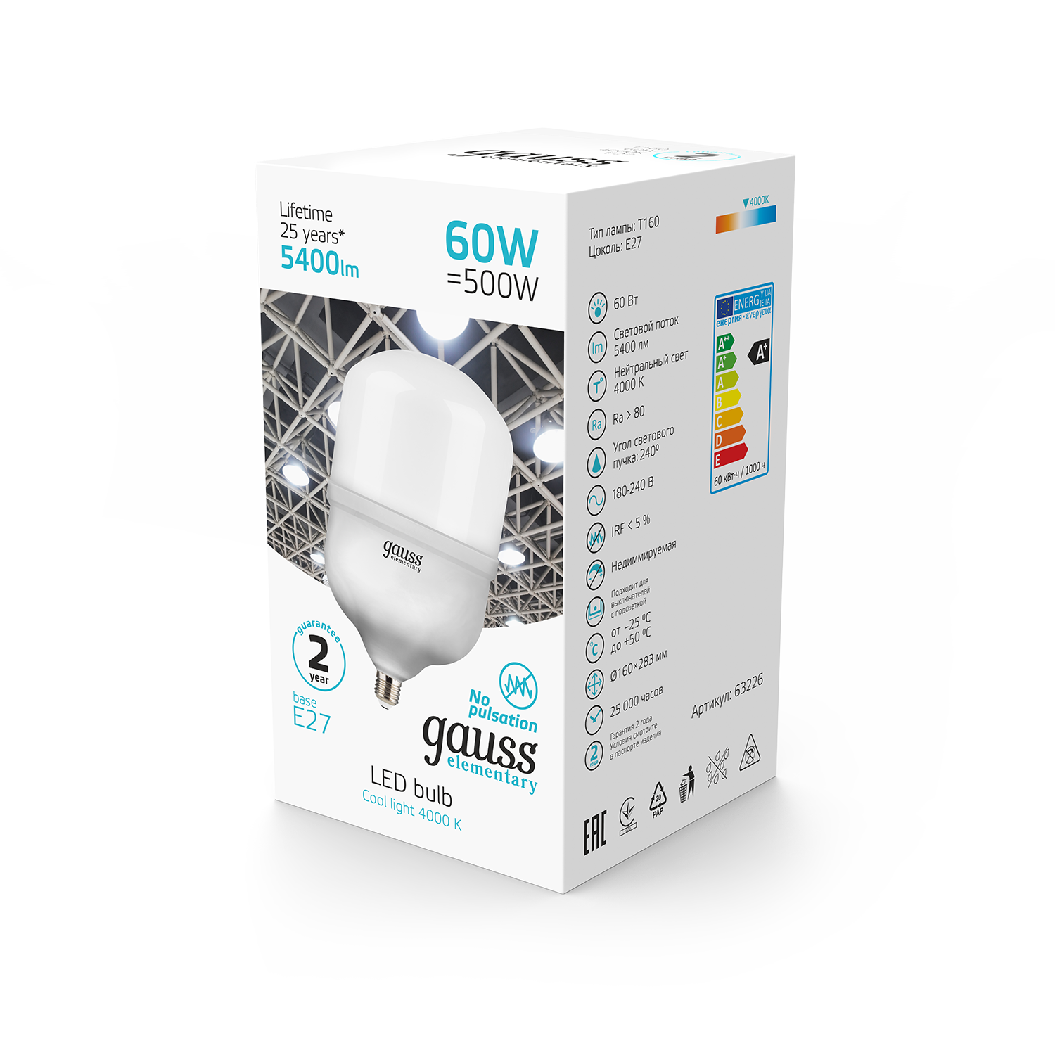 Лампочка светодиодная E27 T160 60W 220V нейтр белый свет 4000K Gauss Elementary 2 411 ₽