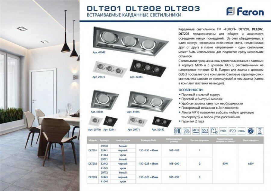Feron DLT202 Светильник потолочный встраиваемый (ИВО) , под лампу MR16 G5.3, 32442 1 шт. 1 461 ₽