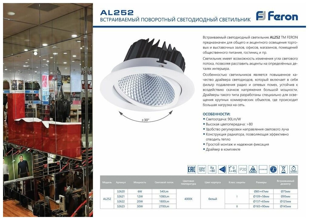Светильник встраиваемый светодиодный 20W, 1800Lm, 4000K, 35 градусов, белый, AL252 с драйвером в комплекте