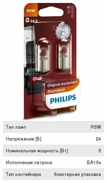 Лампа автомобильная накаливания Philips Standard 13821B2 R5W 5W BA15s 2 шт. информация: