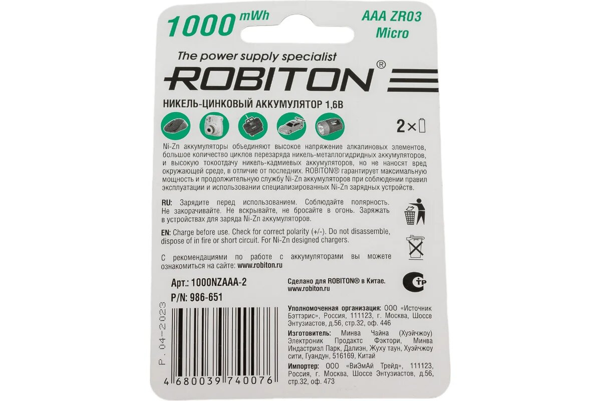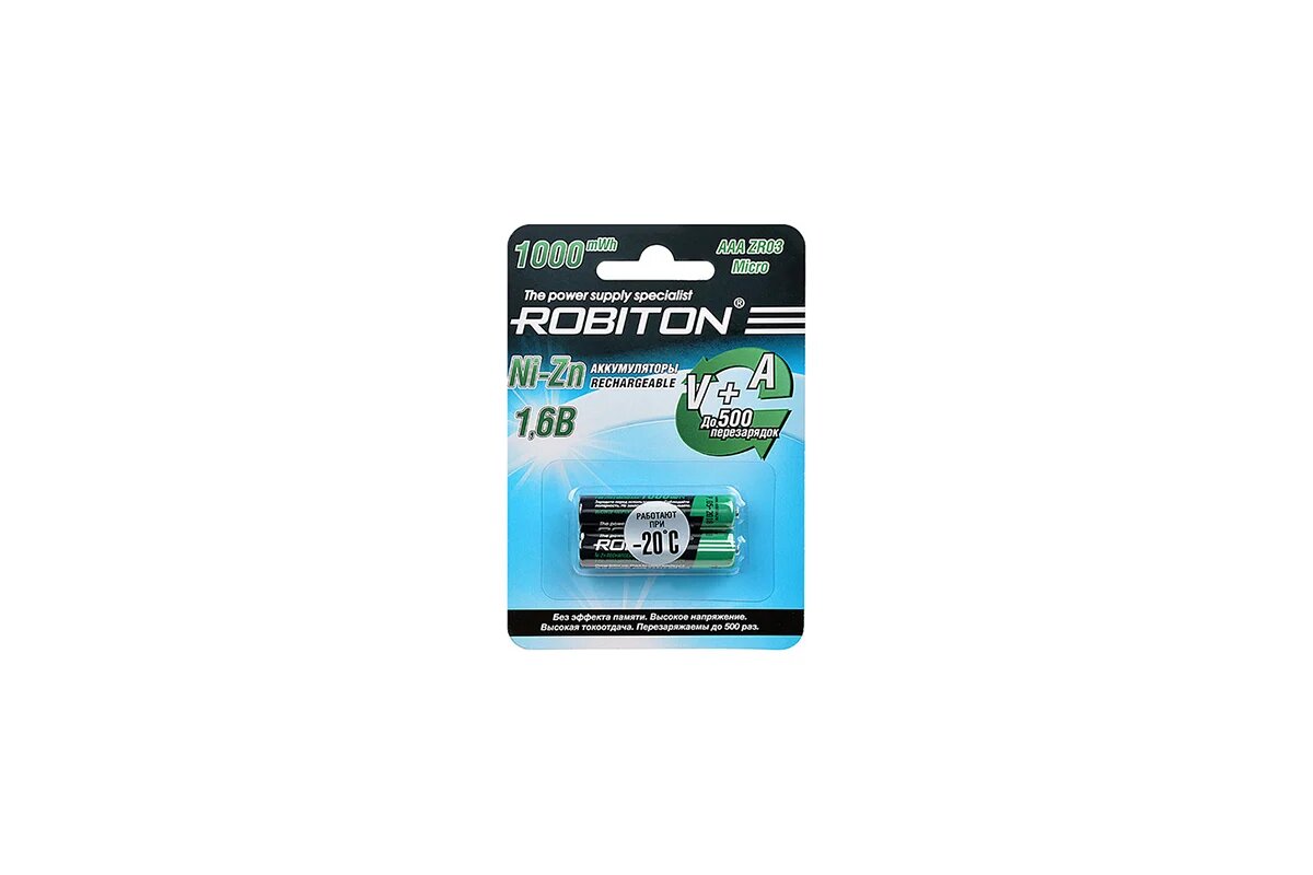 Аккумулятор Ni-Zn Robiton AAA 550мАч 1,6В 1000мВтч 2шт информация: