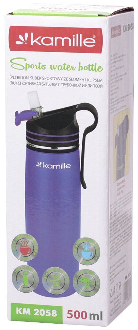 Термос-Бутылка спортивная 500 мл. Kamille KM-2058 из нержавеющей стали с трубочкой и клипсой (2058 / фиолетовый)