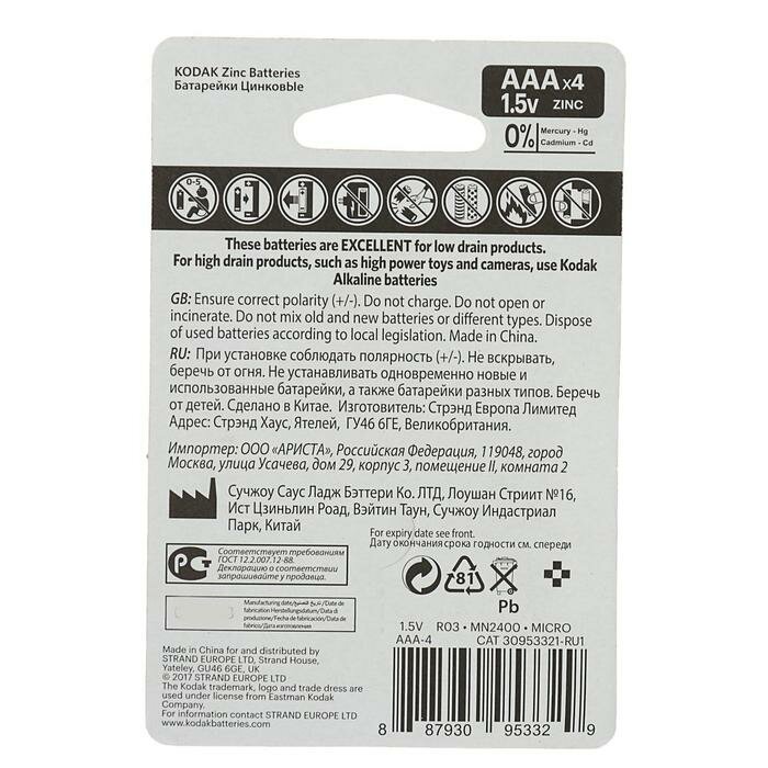 10 цен на Батарейка солевая Kodak Extra Heavy Duty, AAA, R03-4BL, 1.5В, блистер, 4 шт. 475483