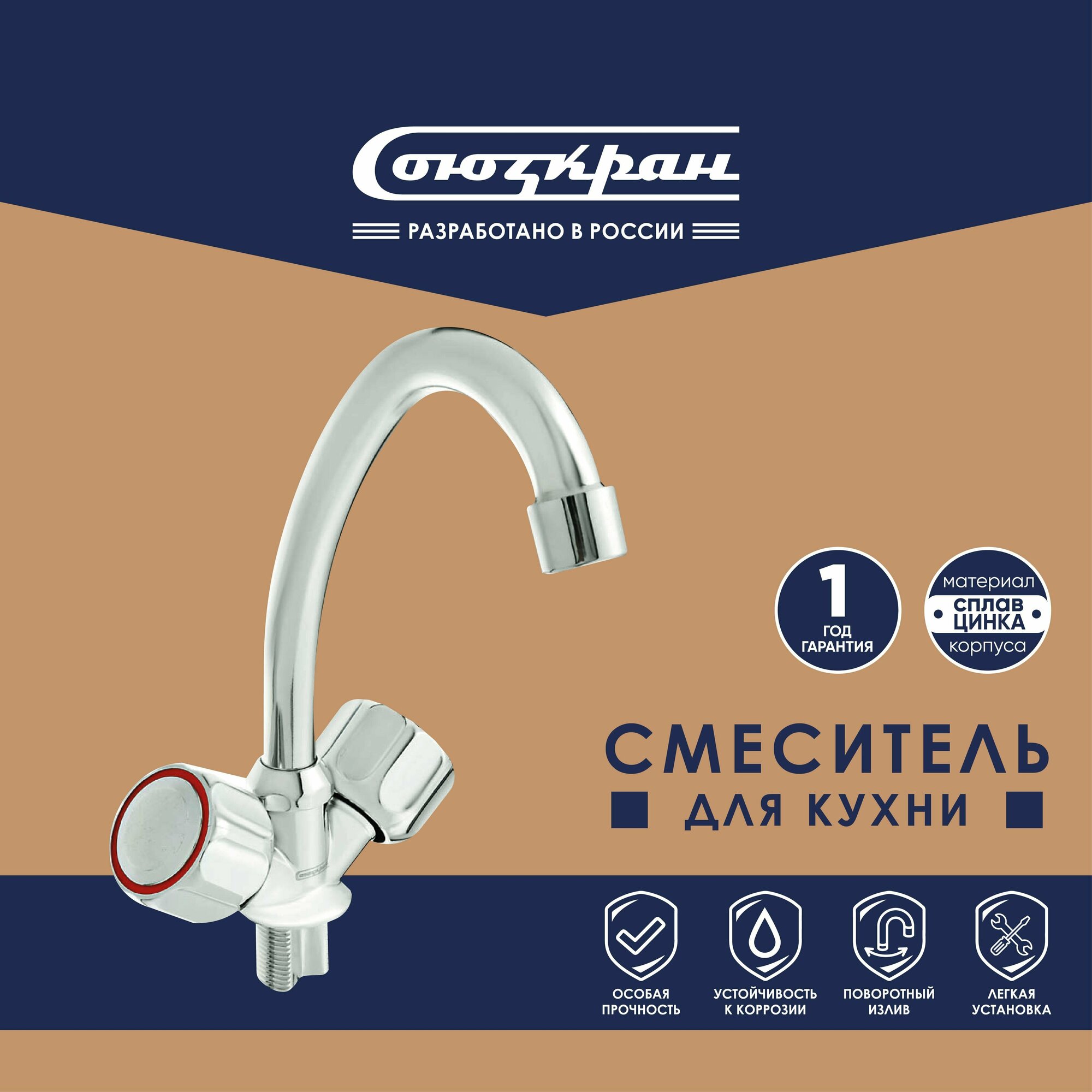 СоюзКран Смеситель для кухни, поворотный излив 25см, керам. кран-буксы 1/2, хром, цинк, SK01-G208