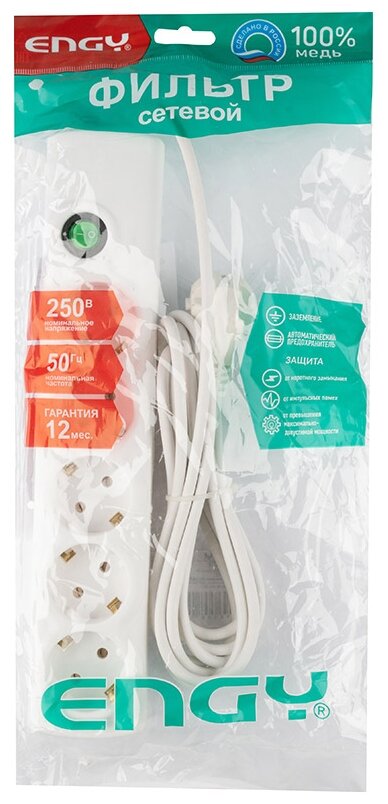 Сетевой фильтр Engy "Сеть-2" 3м/5 роз. (ПВС 3*0,75) белый