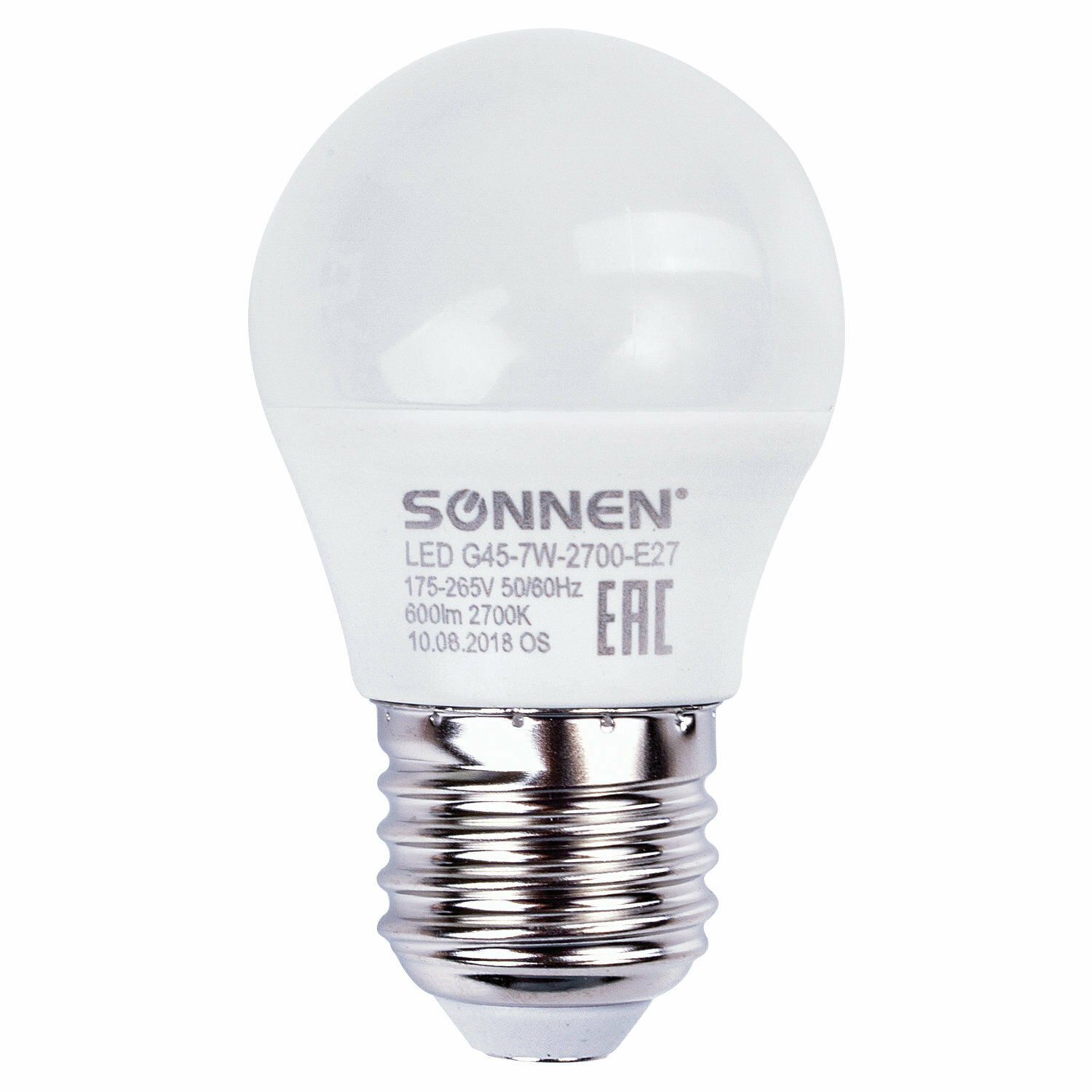 Лампа светодиодная SONNEN, 7 (60) Вт, цоколь E27, шар, теплый белый свет, 30000 ч, LED G45-7W-2700-E27, 453703 - 1 шт.