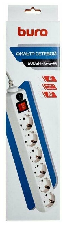 Сетевой фильтр Buro 600SH-16-5-W, 6 розеток, с/з, 16А / 3500 Вт белый 5 м 334 мм 54 мм 41 мм 6 информация: