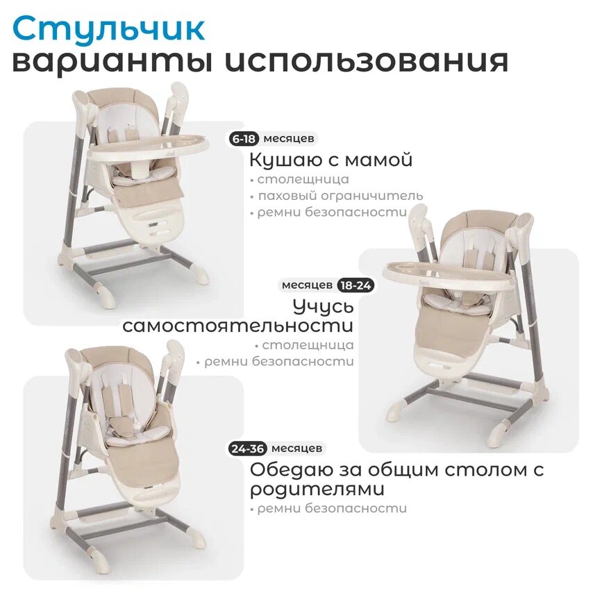 | Дополнительная информация | Максимальная нагрузка: электрокачели до 9 кг, стульчик для кормления (трансформер) до 18 кг, 2 позиции регулировки спинки кресла электрокачелей, работает от 4 батареек типа «D» и от адаптера, 12 мелодий с регулировкой громкости и 2 звука природы, таймер 8, 15 и 30 минут |