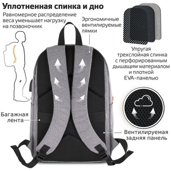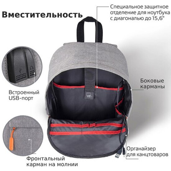 Рюкзак Brauberg 270806 URBAN с отделением для ноутбука USB-порт серый 44х31х14 см информация:
