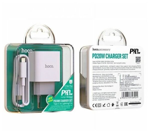 | Подробная комплектация | Cетевой блок питания с разъемом (Сетевое зарядное устройство с кабелем/шнур/провод для айфона /HOCO C76A Plus 20 Вт PD Type C) - 1 шт. Кабель для зарядки Apple 8-pin (lightning) - 1шт. Упаковка - 1 шт. |