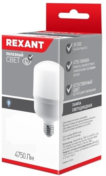 604-150 REXANT Лампа светодиодная высокомощная 50 Вт E27 с переходником на E40 4750 Лм 4000 K нейтральный свет REXANT информация: