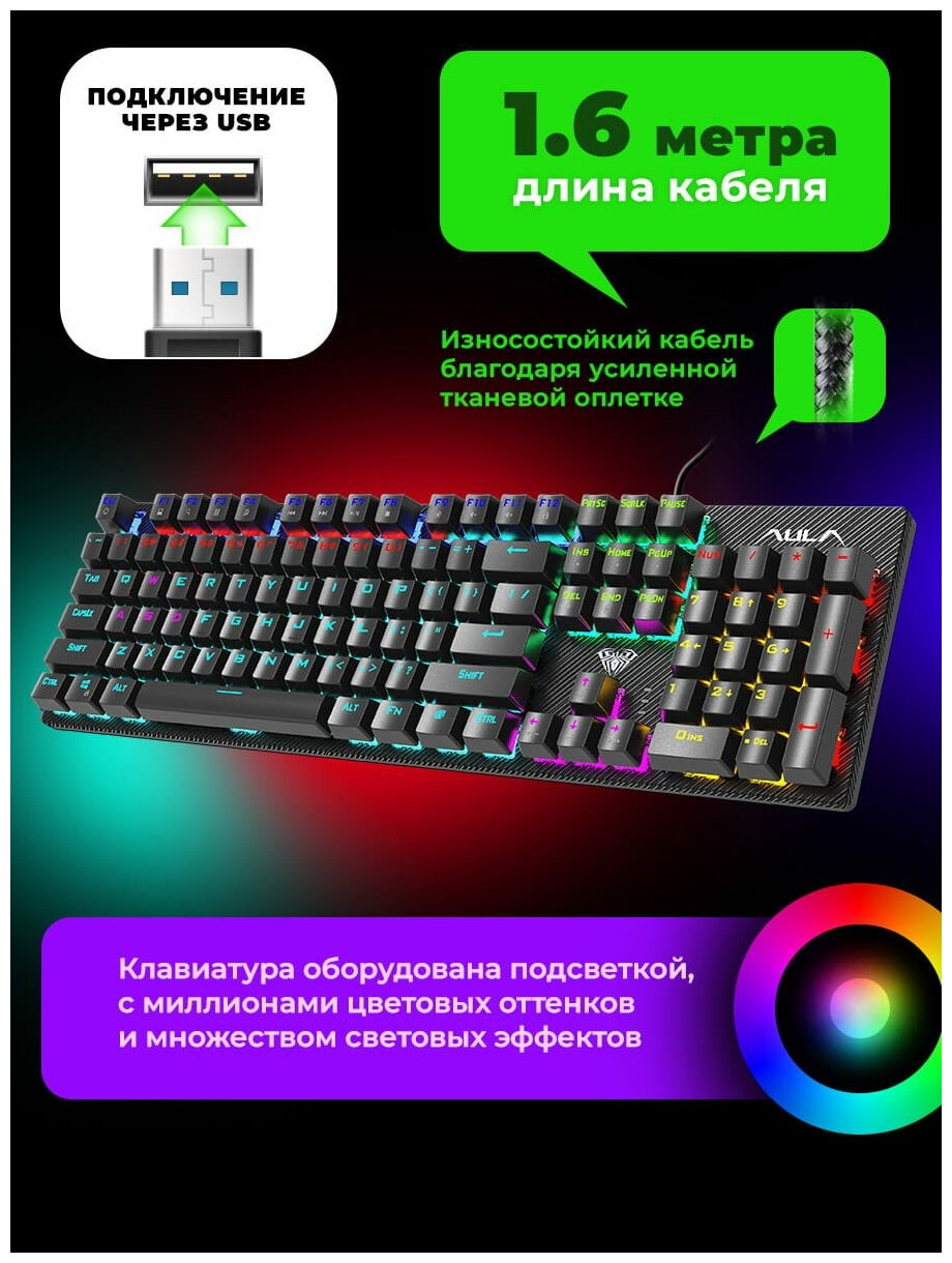 Клавиатура проводная AULA, S2022, механическая, подсветка, USB, цвет: чёрный