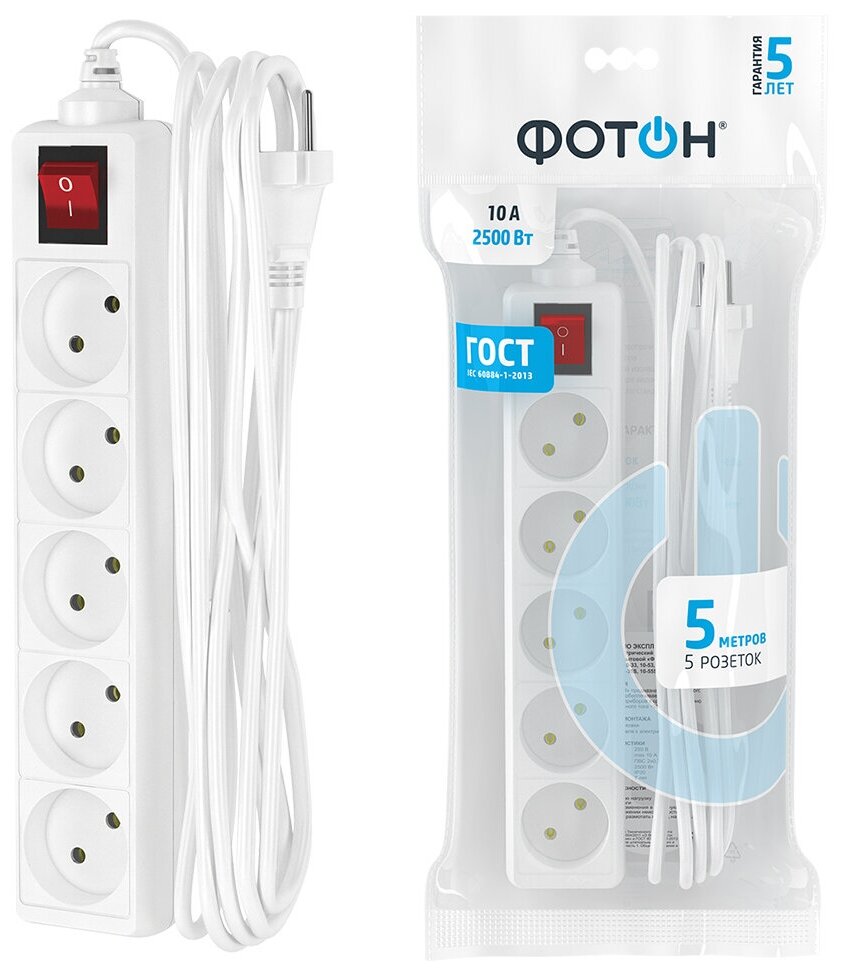 Удлинитель сетевой "фотон" 10-55S, 5м, 5 розеток, белый, ГОСТ