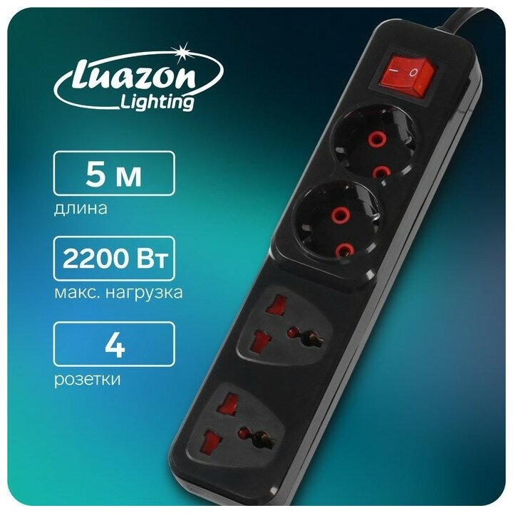 10 цен на Удлинитель Luazon, 4 гнезда, 2 евро + 2 универсальные, с выкл, 2200Вт, 5 м, 220В, черный 5101837