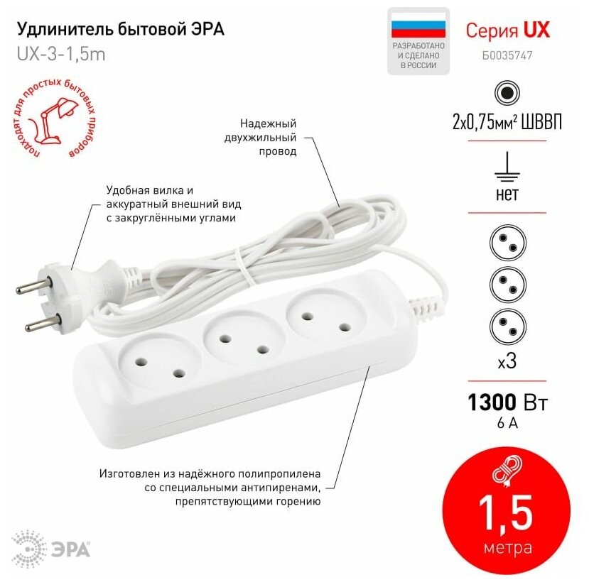 ЭРА сет. удл. ШВВП 2х0.75 3 роз. 1.5 м 6А/1300Вт (корпус негорючий PP) UX-3-1.5m (РФ) 5004 (арт. 724022) информация: