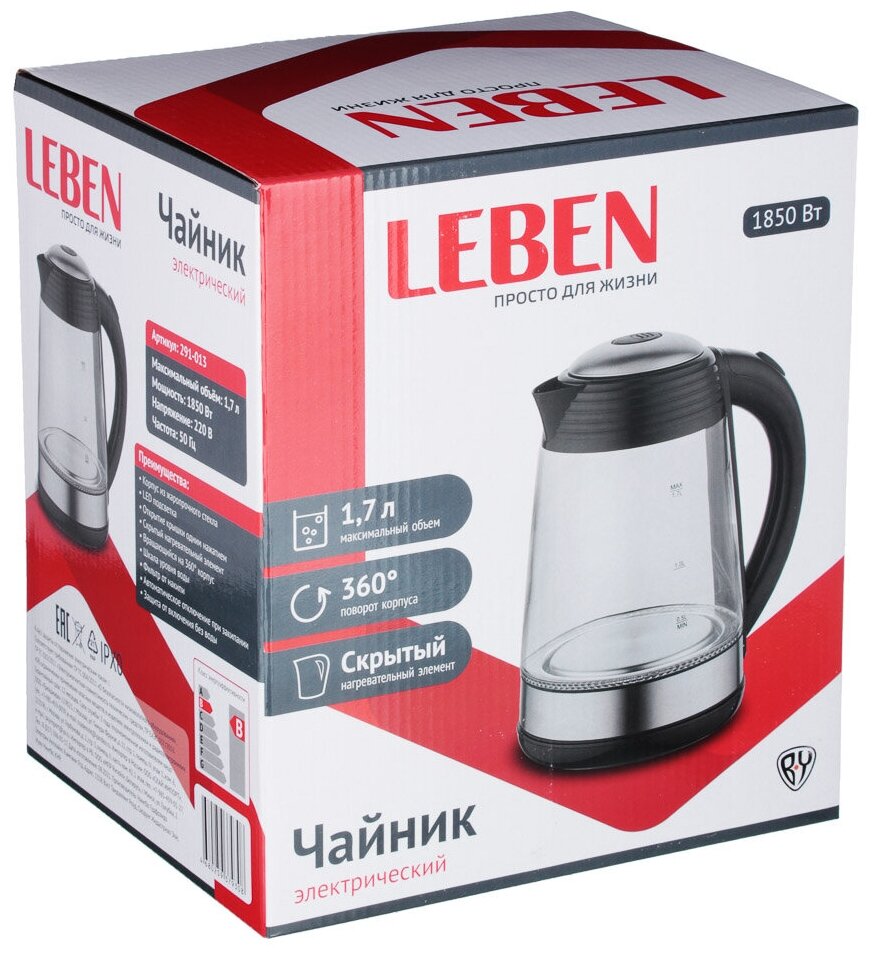 Чайник электрисеский LEBEN 291-013 1,7л, 1850 Вт, хром/черный информация: