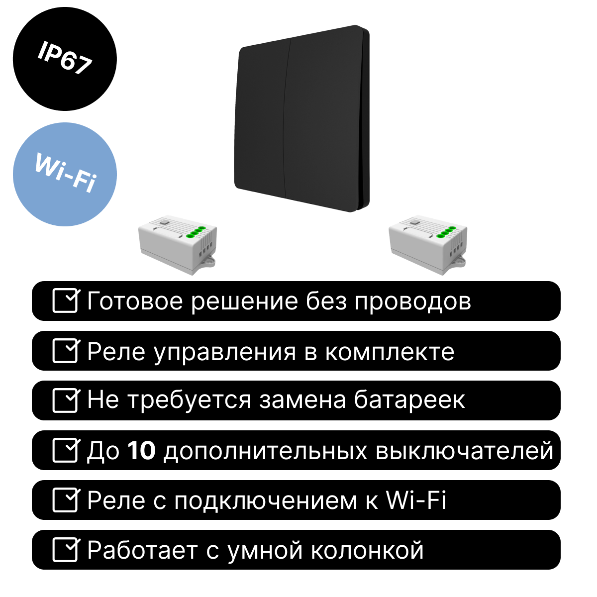 Умный беспроводной выключатель GRITT Space 2кл. черный комплект: 1 выкл. IP67, 2 реле 1000Вт 433 + WiFi с управлением со смартфона