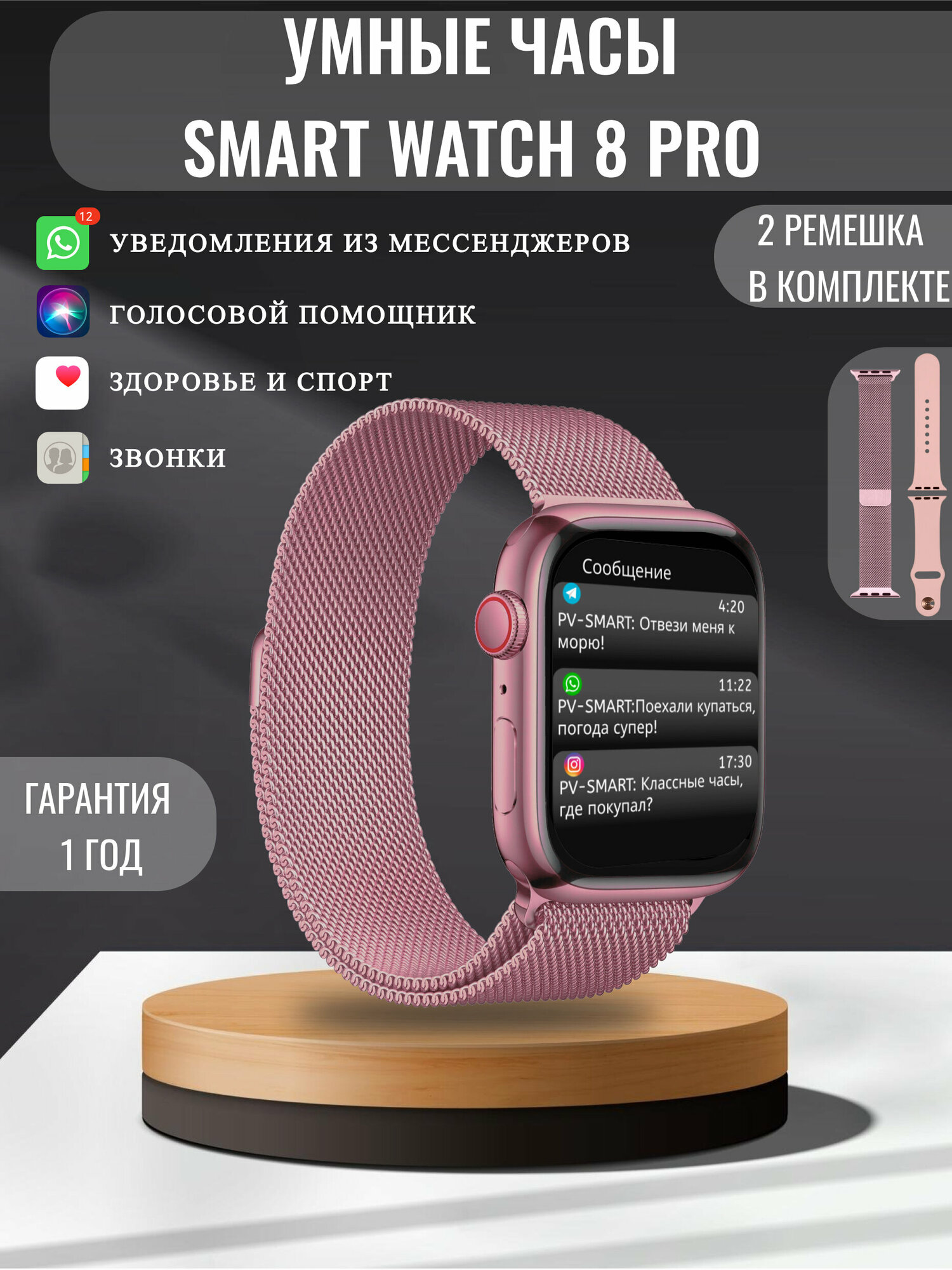 Отзывы на Смарт часы 8 женские мужские детские умные Smart Watch / розовые / два ремешка в комплекта: металлический и силиконовый