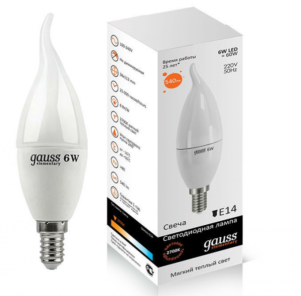 Лампа светодиодная свеча на ветру 6Вт E14 3000К теплая Gauss LED Elementary Candle Tailed информация: