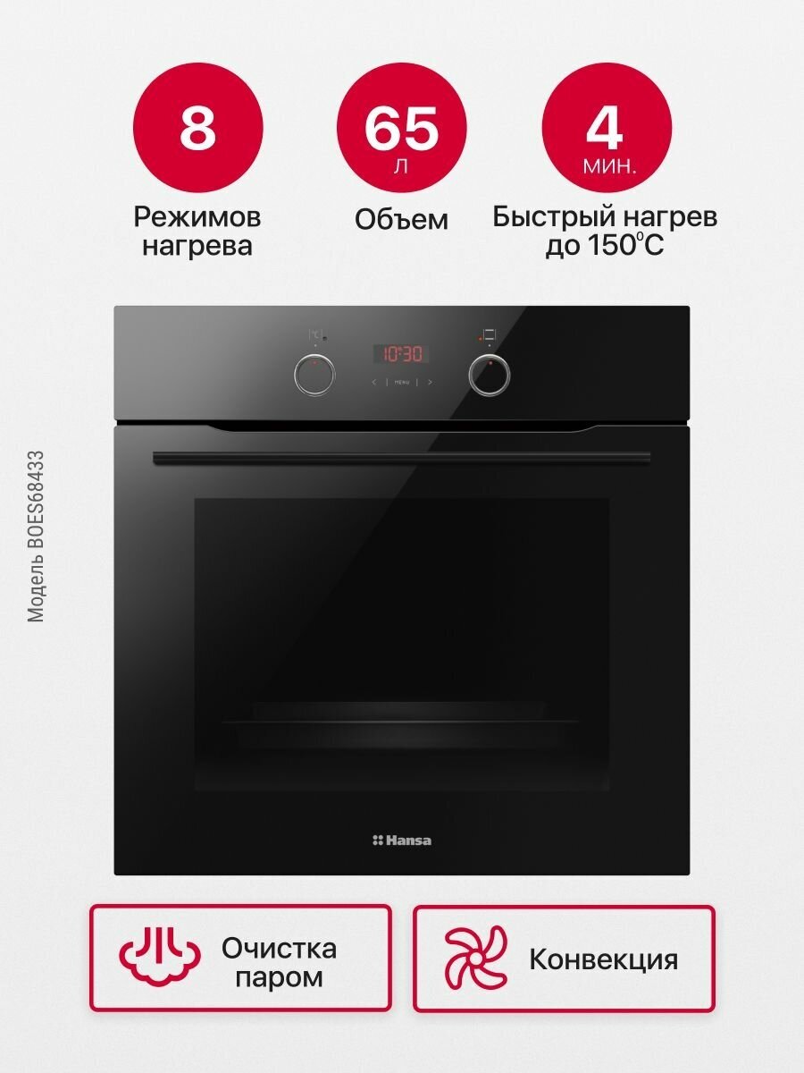 Электрический духовой шкаф Hansa встраиваемый BOES68433, 60 см, с грилем и конвекцией, 8 режимов нагрева, с таймером, быстрый предварительный нагрев, очистка паром 41 990 ₽