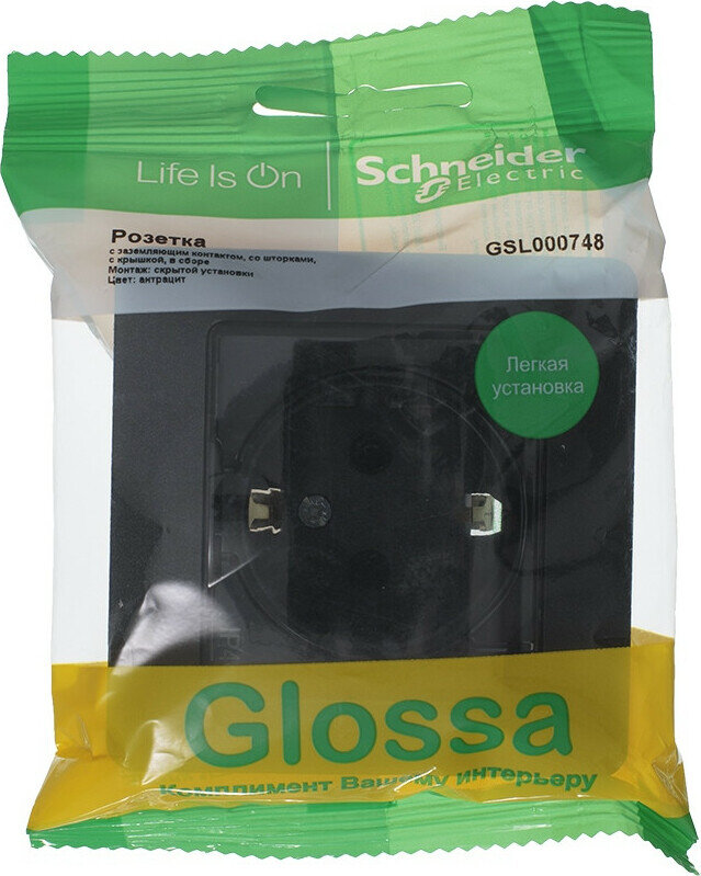 Отзывы на Schneider Electric GLOSSA розетка СУ 1 место антрацит (пласт. осн., земля, шторки, крышка, IP44) GSL000748