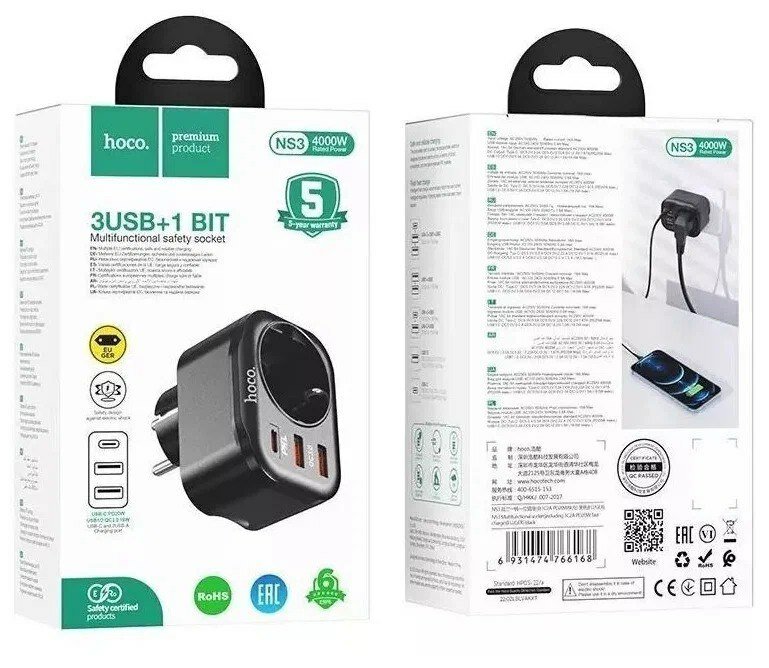 Отзывы на Многофункциональная розетка/Сетевой фильтр HOCO NS3, 1 гнездо + USB-C(PD 20W) + 2USB QC3.0 18W, Черный