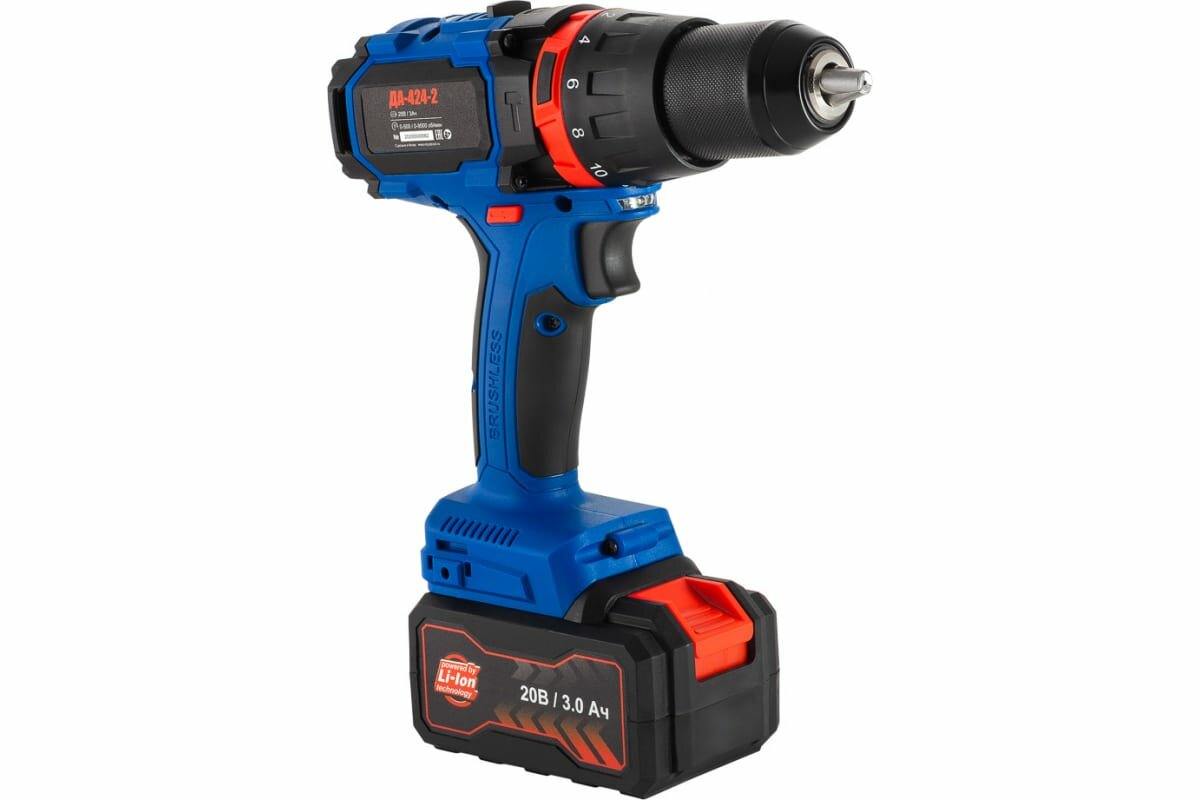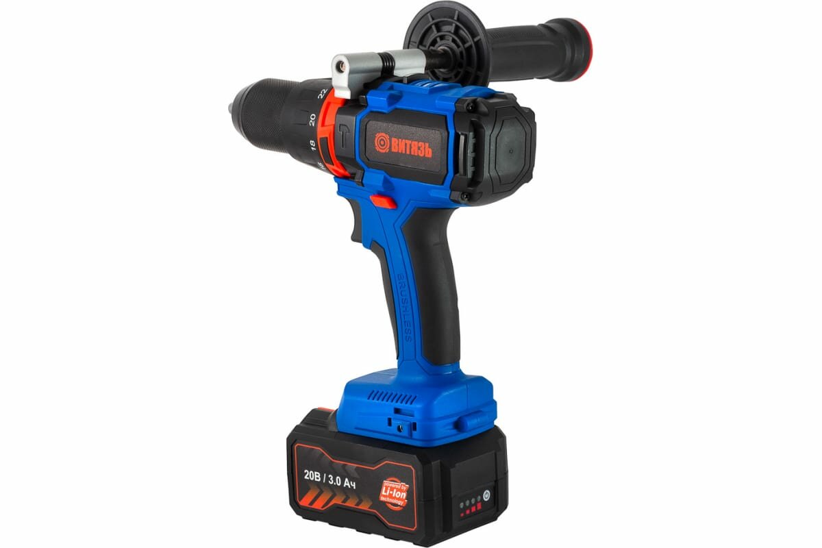 Дрель-шуруповерт аккумуляторная Витязь ДА-424-2, 2 АКБ Li-ion 20 В / 3.0 Ач, индикатор заряда, подсветка, удар, фиксация шпинделя, бесщеточный, 2 скорости 0-500/ 0-8000 об/мин, 0-2000/ 0- 12000 уд/мин