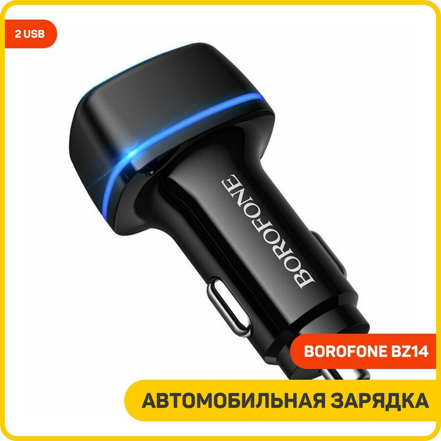 Автомобильное зарядное устройство (АЗУ) Borofone BZ14 Max, 2 разъема USB, быстрая зарядка, LED подсветка, 2.4А, 12Вт, черный