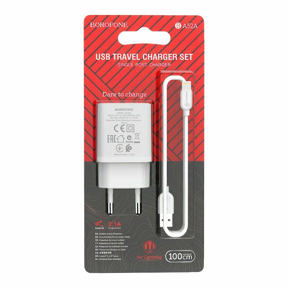 Сетевое зарядное устройство BOROFONE BA52A Gamble 1xUSB с Кабелем USB - Lightning, 2.1A, белый