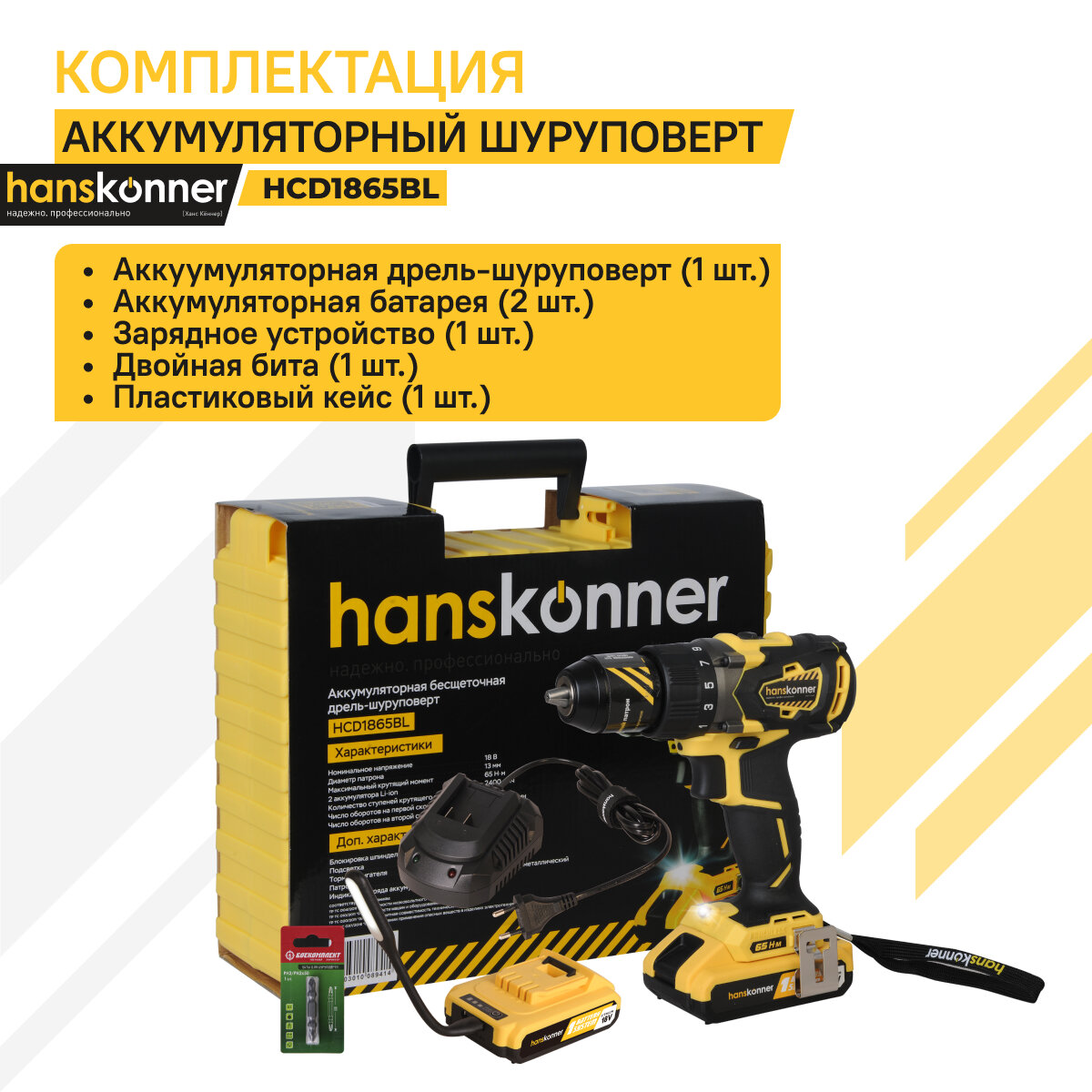дрель-шуруповерт HANSKONNER HCD1865BL 18В Li-Ion 2,4Ач бесщеточная 2 АКБ