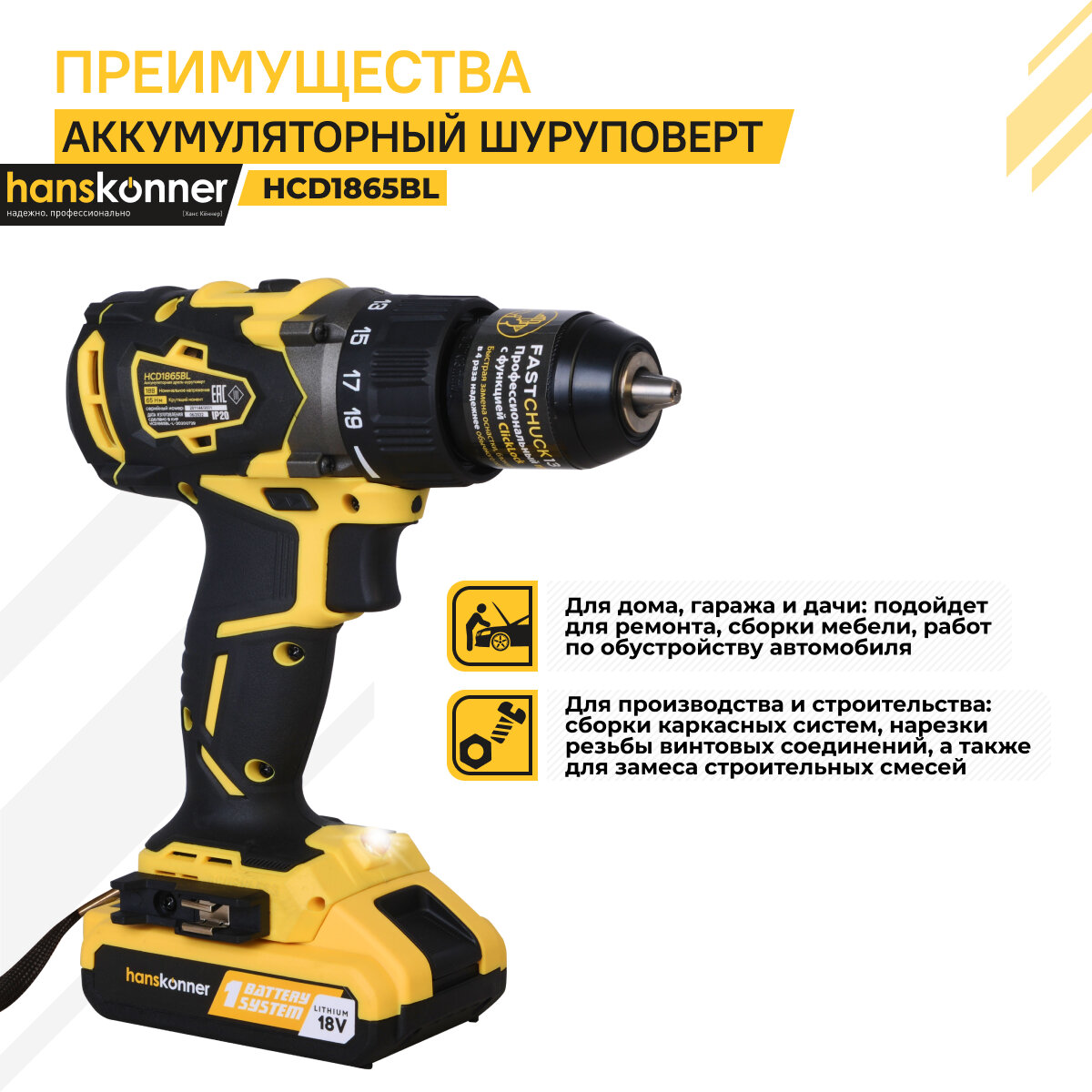 Аккумуляторный шуруповерт Hanskonner HCD1865BL Unibattery информация:
