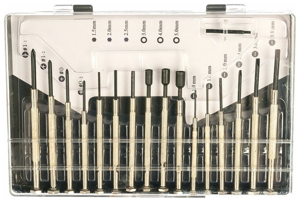 | Отвертки подробно | SL:1.0-1.4-2.0-2.4-3.0-3.8mm PH:00-0-1-2 HEX:1.5-2-2.5, головки :3.0-4.0-5.00 |