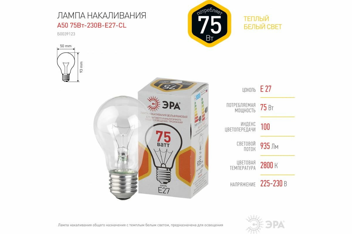 Отзывы на ЭРА (10 шт.) Лампа накаливания ЭРА E27 75W 2700K прозрачная A50 75-230-Е27-CL Б0039123