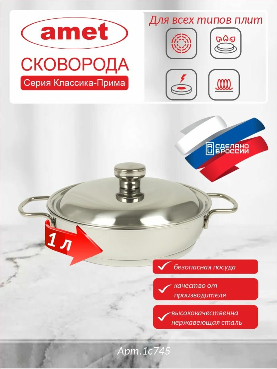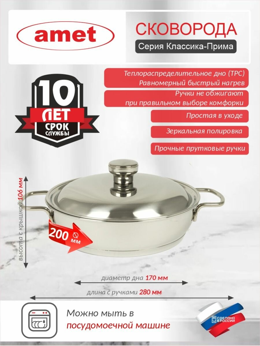 Сковорода Амет «Классика-прима» 1 л с двумя ручками и металлической крышкой 200 мм 1с745