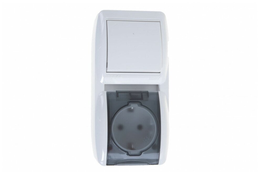 Блок переключателя с розеткой Lezard NATA 710-0200-172 вертикальный одноклавишный открытая установка белый с заземлением с крышкой